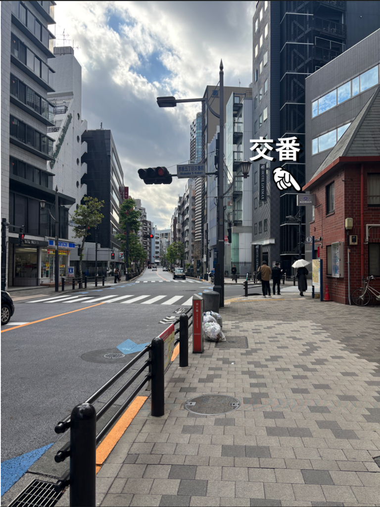 ③約200m真っ直ぐ行くと「交番」が見えてきます。交番の先の交差点を渡り、さらに真っ直ぐ進みます。