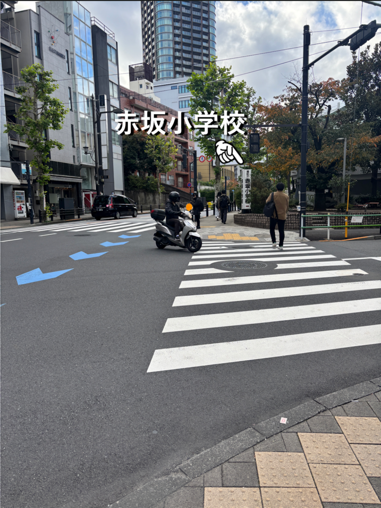 ④約200m進むと再び交差点に突き当たります。交差点の先に「赤坂小学校」という看板が見えます。交差点を渡ります。