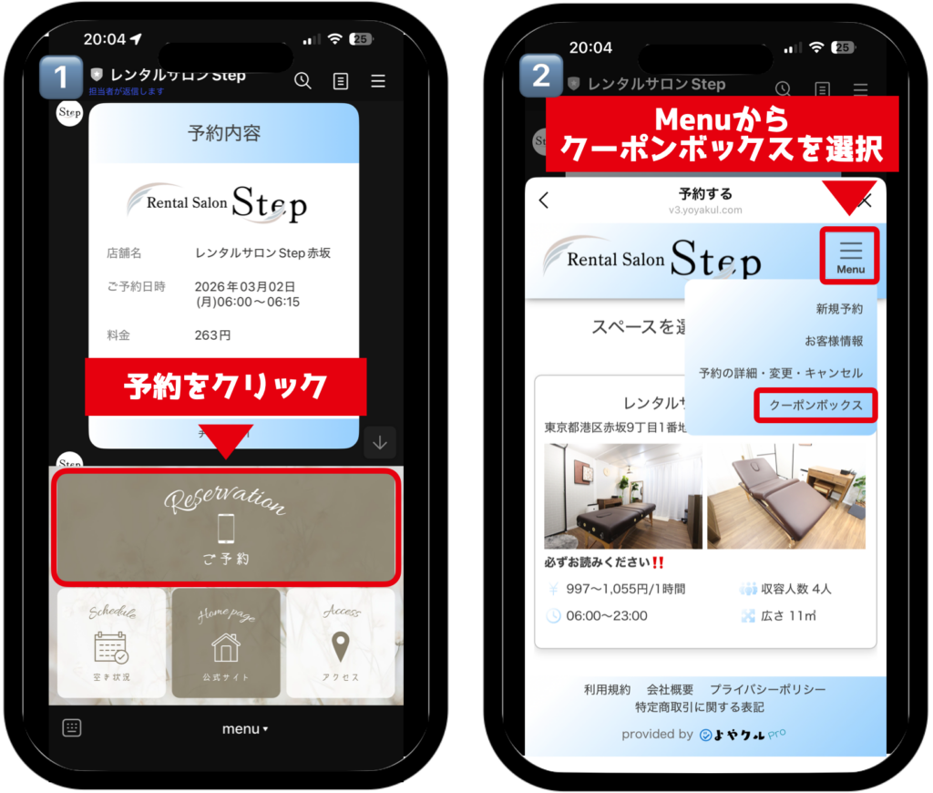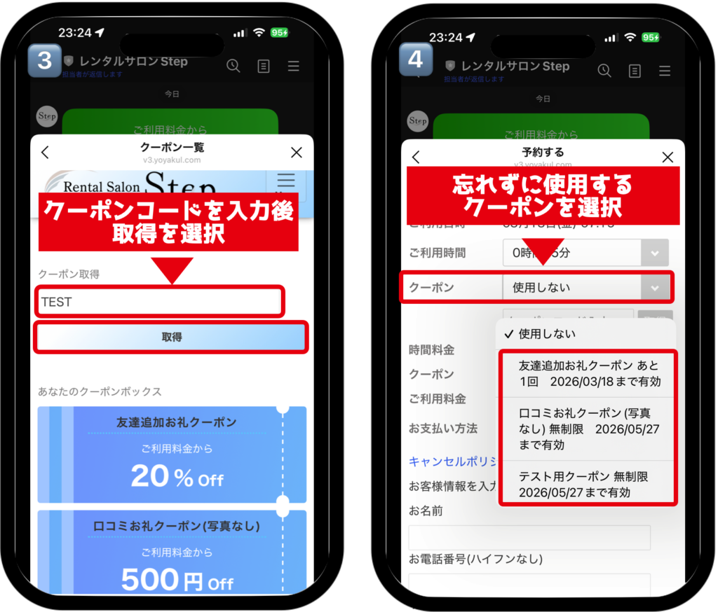 ④予約画面で利用日時と利用時間を選び、クーポンを使用し、料金を確認