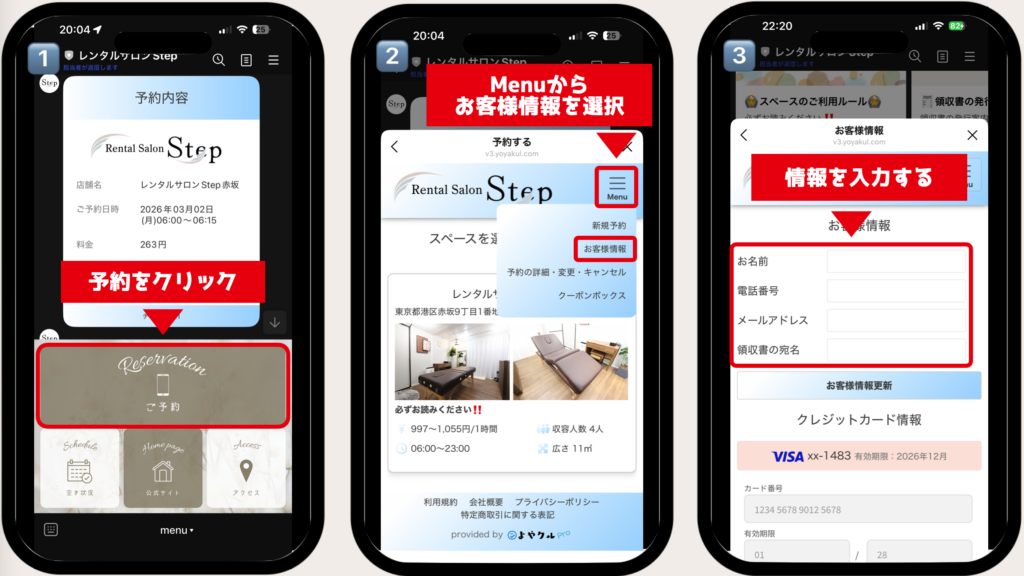 ※領収書の発行には「お客様情報」を事前に入力いただく必要がございます。 入力がお済みでない方は以下の手順でご入力ください。
